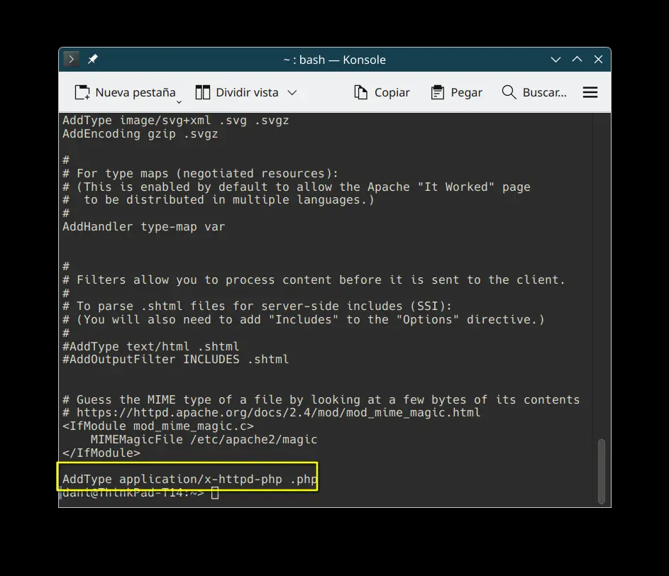 Una vez instalado, descomentamos o añadimos esta línea en al archivo de configuración /etc/apache2/mod_mime-defaults.conf