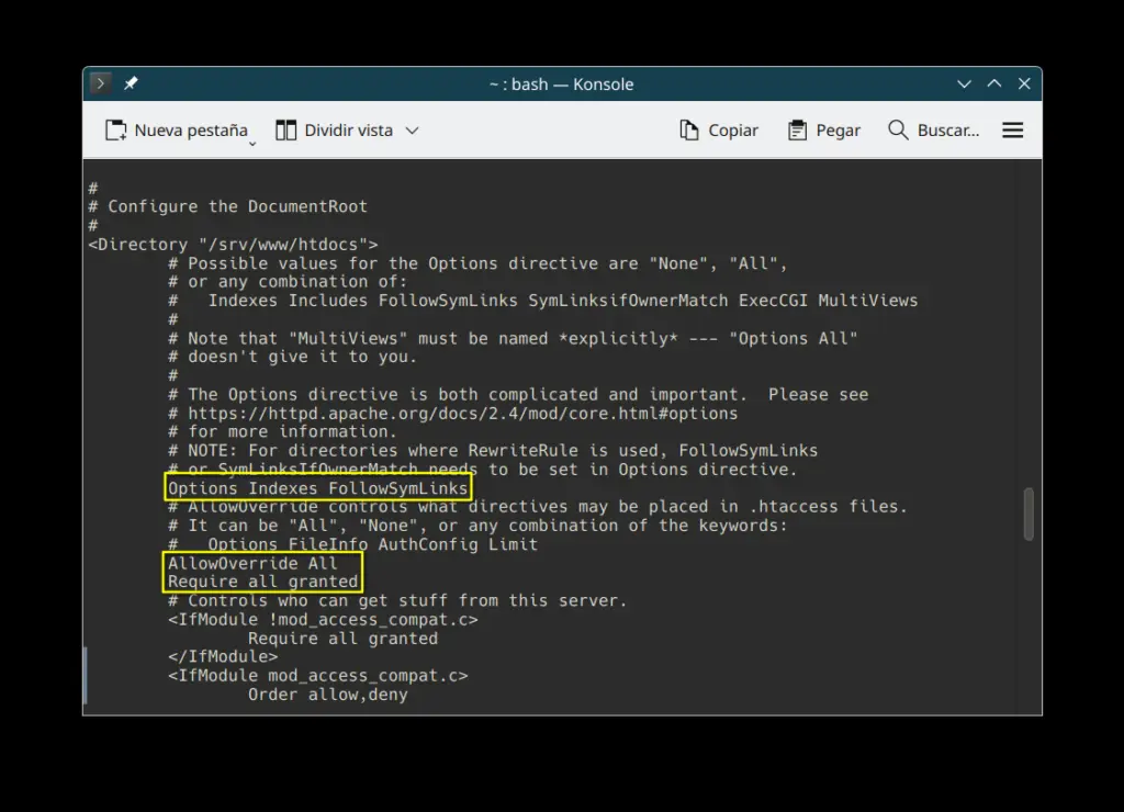 Dentro del archivo de configuración de Apache, concretamente al principio, en el apartado «<Directory «/srv/www/htdocs»>», necesitamos añadir o descomentar estas líneas: